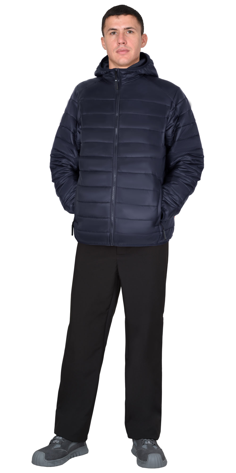 Куртка, утепленная из стёганного полотна, с центральной бортовой застёжкой молния, с втачным капюшоном, с общей кокеткой полочек и спинки, с втачными рукавами, с карманами на молнии в шве рельефа, с удлинённой фигурной линией низа на спинке. Низ куртки, низ рукавов и лицевой вырез капюшона окантованы эластичной тесьмой.