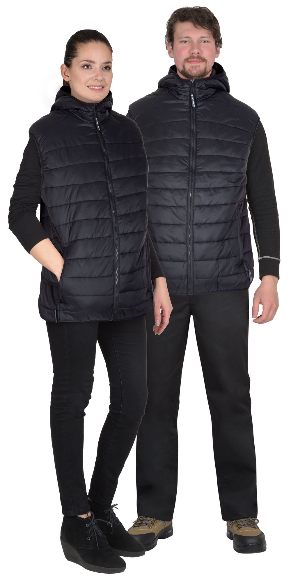 Жилет утепленный из стёганого полотна, с центральной бортовой застёжкой на молнию, с втачным капюшоном, с общей кокеткой полочек и спинки, с карманами на молнии в шве рельефа, с удлинённой фигурной линией низа на спинке. Низ куртки, пройма и лицевой вырез капюшона окантованы эластичной тесьмой.